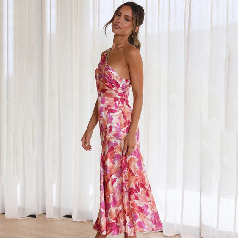 Upgrade your wardrobe with the enchanting charm of our Floral Whisper One-Shoulder Dress. Designed for elegance with a touch of nature's allure, this dress features a lush array of pink and peach floral patterns cascading on a luxurious satin fabric. The elegant one-shoulder neckline adds an asymmetrical flair that creates a captivating silhouette, while the fitted design accentuates your curves with grace.