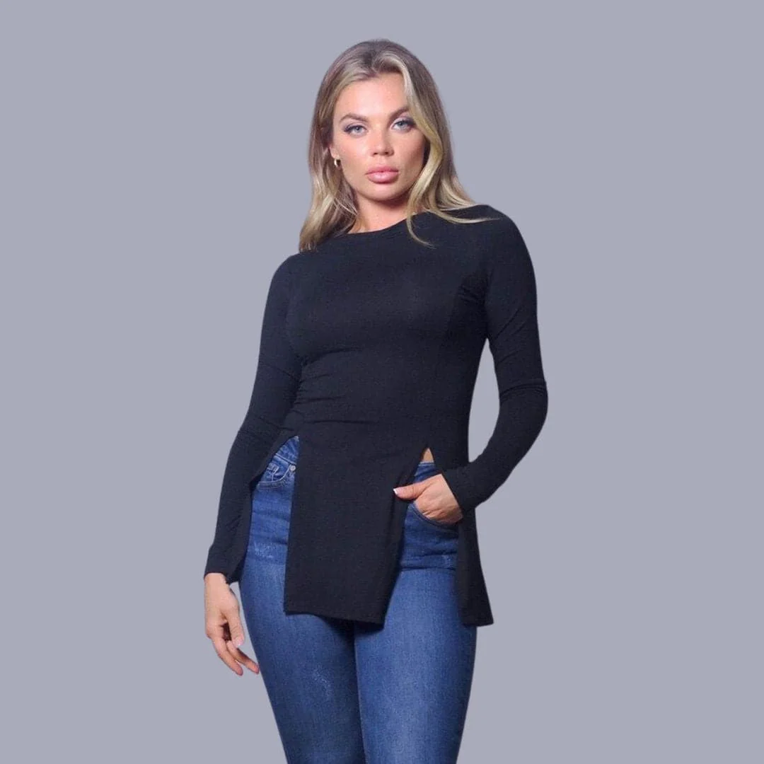 Women's Blouse - Long Sleeve Slim Fit - Round Neck - Asymmetric Hem - Stretchable Material