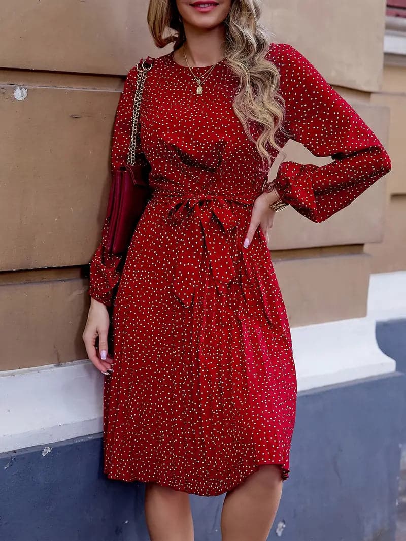 Dress for Women - Polka Dot Pattern - Cinched Waist - Long Sleeves - Round Neck